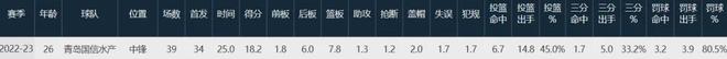 這哥們於22-23賽季效力青島隊,出戰39場比賽,場均上陣25分鍾,貢獻18.2分7.8板1.3助1.2斷2帽,投籃命中率45%,場均以33.2%命中率扔進1.7記三分球,而楊瀚森23-24賽季才正式開啟CBA生涯。