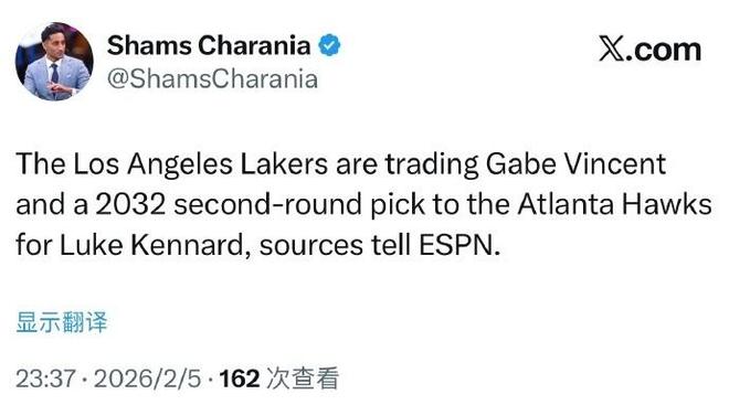 根據ESPN名記Shams報道,湖人與老鷹完成2換1交易,湖人將文森特和2032年次輪簽送至老鷹,換回神射手肯納德,有望提升湖人的外線投射能力。