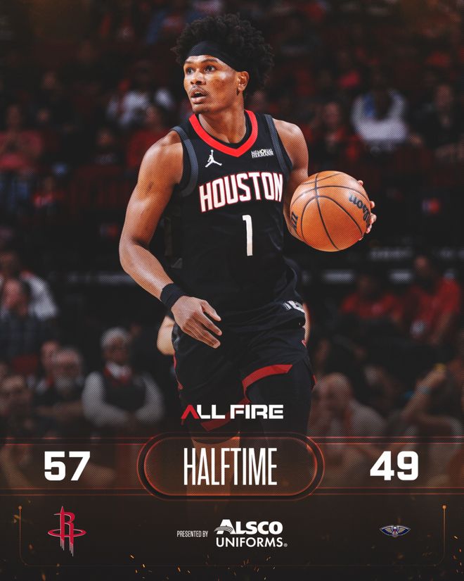 火箭隊的申京缺席,芬尼-史密斯進入首發。開場的5平後湯普森連進兩球,火箭隊取得領先。錫安和墨菲聯手6分幫助球隊反超,杜蘭特轉身跳投回應,兩隊戰成16平。21平、24平後卡佩拉和史密斯輪流扣籃,火箭隊以28-24領先4分結束首節。