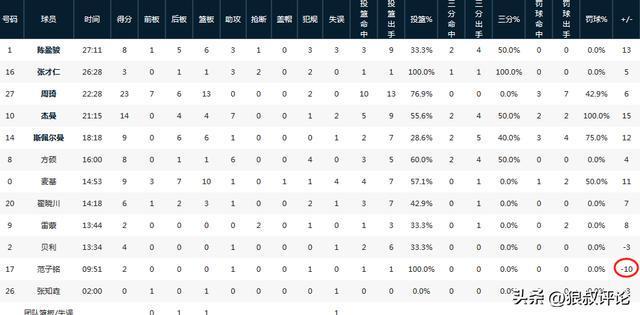 首先是以北京對陣天津的比賽為例子,雖然北京男籃順利贏球,但範子銘出戰接近10分鍾,一次出手2分命中,但沒有搶下一個籃板球,在場效率為-10,是北京男籃所有登場球員當中,唯一是負兩位數的。