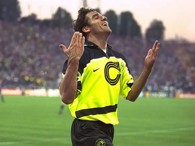 雖然頂著歐洲杯金靴的光環,可是裏德爾在俱樂部的日子並不好過。當時他效力於意甲的拉齊奧,隊內有另一位大神西格諾裏,裏德爾的戰術地位和出場時間都受到了擠壓。於是,1993年,他重返德甲,加盟了多特蒙德。